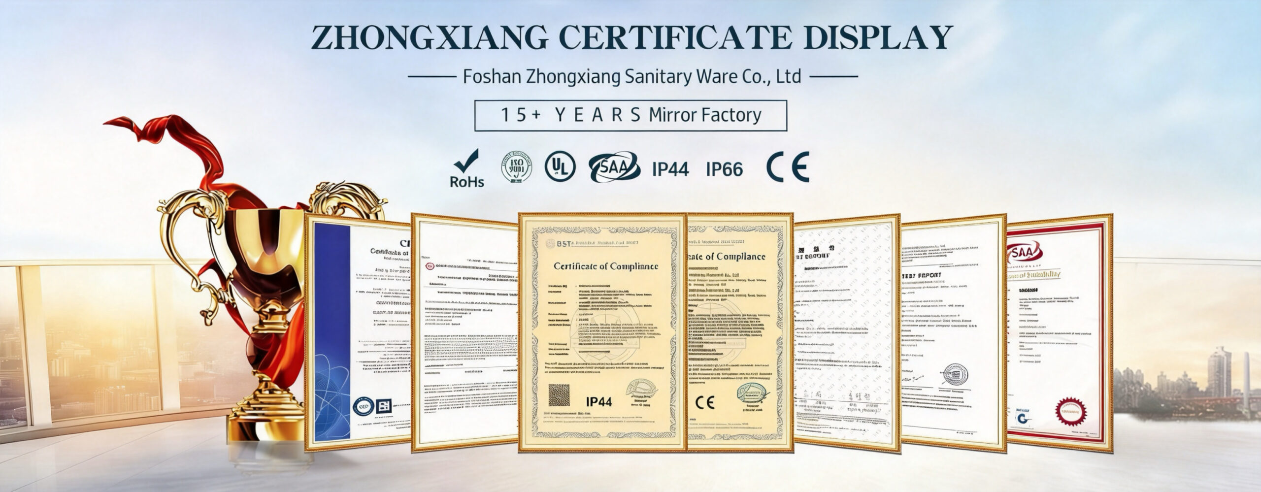 Zhongxiang Sanitary Ware is an innovative enterprise specializing in the production of premium smart LED mirrors and bathroom cabinets. Our mission is “Focus on craftsmanship, relentless innovation, and delivering the highest quality in every product”. Our newly designed smart mirror series has been granted multiple patents, including national utility model patents and industrial design patents. Our products are sold worldwide, such as the United States, Spain, Italy and other European countries, as well as the Middle East and Africa, and are highly praised by domestic and foreign distributors, agents and customers.